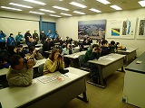 令和8年1月25日(日)、風がとても冷たい日でしたが、鳥たちにとってはいい気温かもしれません。一昨年は間近でコハクチョウ、昨年はルリビタキを観察できましたが今年はどんな野鳥と出会えるでしょうか。まずは講座室で博物館ボランティア野鳥チームの阿部さんからチームの活動紹介と、動物研究室の佐野先生から双眼鏡のレクチャーを受け、いざ野鳥探しに出発です!