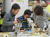 採取した土を顕微鏡で観察です。どんな土壌動物が見えてますか?先生の話によるとダニ,トビムシ,カニムシ,ミミズ,ムカデなどたくさんの生きものが存在しているとのことでした。みなさん顕微鏡に釘づけでした。 |