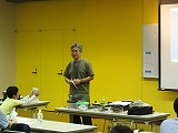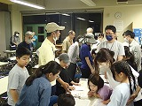 まずは、動物研究室の久松先生から本日のミッションを与えられました。最初は「三人のサインをもらって友達になろう」です。先生やボランティアさん、初めて会った会員どうしてでサインをもらい、仲良くなりました。次にホタルについてレクチャーがあり、実際にホタルの幼虫を観察し、ホタルクイズに全問正解したら、いよいよ野外に出発です。