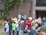 準備ができたので、2班に分かれて観察会に出発します。花木の広場で最初に見つけることができたのは、ルリビタキでした。「最初からルリビタキが見られるなんて・・・ツイてますよ!」そんなことを言われるとテンション上がりますね。その後も鳥が枝の先の見やすいところに来たらボランティアさんがすぐに教えてくれて、子どもたちもしっかり観察できたようです。とんぼの池周辺では一瞬カワセミが横切ったようですが、それは難しかった!