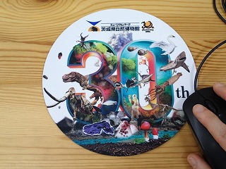 オリジナルグッズ「30周年展オリジナルマウスパッド」は、直径18cmの円にデザインされた30はインパクト抜群!博物館ロゴのとなりにはマンモスの頭部や牙をイメージした30周年企画展記念ロゴもデザインしています。表面はポリエステルクロスで手触りが優しく、裏面は合成ゴムでしっかり固定されます。いつものパソコン作業に彩りが生まれます。
